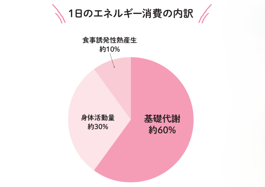 - 基礎代謝(約60%): 呼吸や体温維持など、生命維持に最低限必要なエネルギー