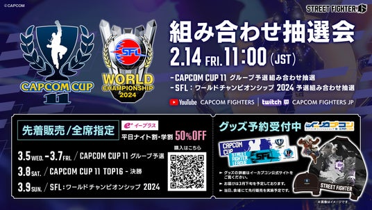 出場選手やチームが続々と出揃い、ますます注目度が高まる本大会ですが、「CAPCOM CUP 11」のグループ予選の振り分けと「ストリートファイターリーグ: ワールドチャンピオンシップ 2024」の予選時のHOMEサイド、AWAYサイドを決定する「予選組み合わせ抽選会」を2月14日(金)11:00より配信いたします。