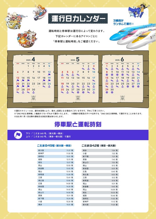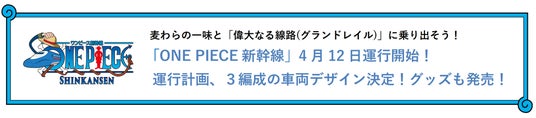 麦わらの一味と「偉大なる線路(グランドレイル)」に乗り出そう!「ONE PIECE新幹線」4月12日運行開始!運行計画、3編成の車両デザイン決定!グッズも発売!