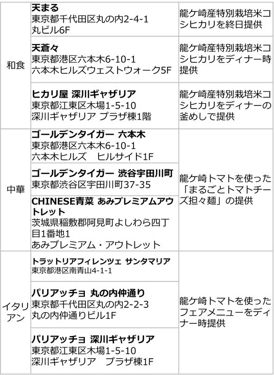 フェアは特別栽培米コシヒカリの美味しさを伝える和食3店舗、龍ケ崎トマトの美味しさを伝える中華3店舗及びイタリアン3店舗の合計9店舗にて開催。都内は丸の内、六本木、渋谷、木場エリアにて、茨城県内においては、あみプレミアムアウトレット内「CHINESE青菜(チャイニーズ チンツァイ)」(阿見町)で実施します。このフェアに先駆けて、POP UPレストラン「リュウガサキッチン コメカトマト」も2月17日(月)、渋谷にオープンしています。