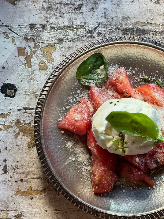 龍ケ崎トマトの味を引き立てるため、味付けはシンプルに塩コショウ、オリーブオイルのみ。ミルキーなブッラータチーズと一緒にどうぞ。これ一皿でワインが進みます。