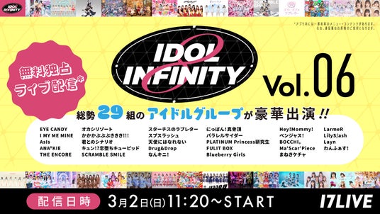 17LIVE株式会社(東京都渋谷区、代表取締役:ジャン・ホンフイ、URL:https://jp.17.live/)が運営する日本最大級のライブ配信アプリ「17LIVE(イチナナ)」は、2025年3月2日(日)にCITY HALL & GALLERY GOTANDA(東京都)で開催され、話題のアイドル総勢29組が参加するアイドルイベント『IDOL ∞ INFINITY(アイドルインフィニティ)vol.6』を、「17LIVE」にて無料独占ライブ配信することが決定しましたのでお知らせいたします。
