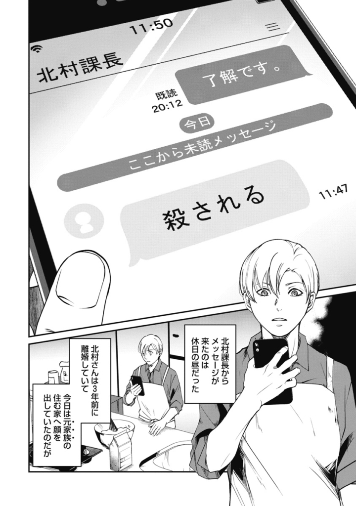 青年の元に届いた、「殺される」というメッセージ。送り主は青年の上司であり、三年前に離婚した元家族のもとへ顔を出していた。様子を見に、その家を訪れた青年の目に飛び込んできたのは…?