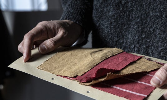 (左下)INK RED = 赤いストライプ柄のリネンデニムを墨染め