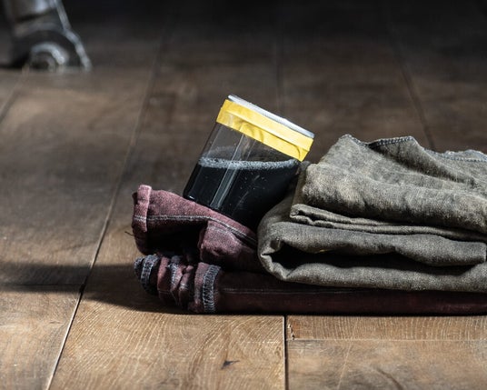 墨染めによる黒系の色で、カラーデニムを染める。黒味が乗るも、赤・黄色のグランドが滲む、独特な色表現に。ところどころの濃淡があり、染めムラがありますが、そこに魅了されました。