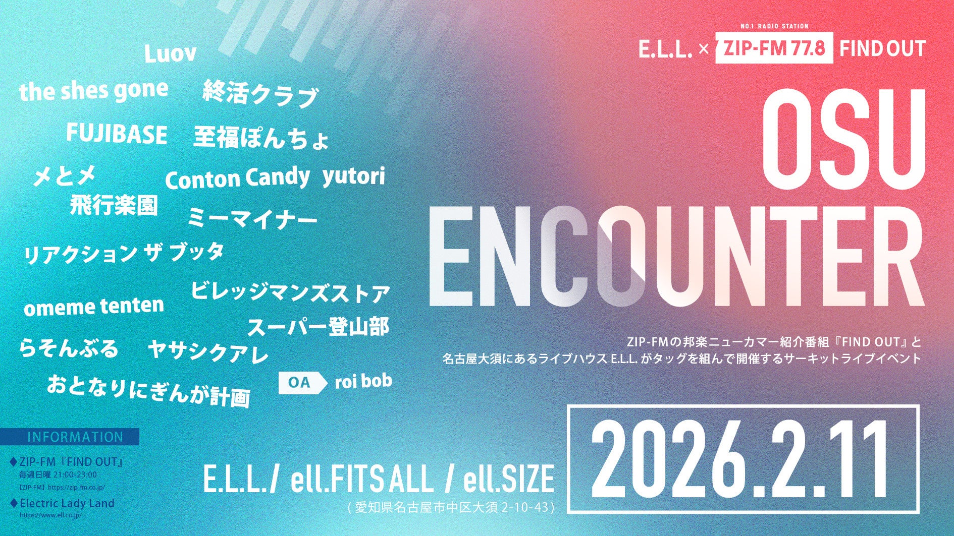 邦楽ニューカマーをいち早く紹介しているZIP-FMのラジオ番組『FIND OUT』と、名古屋・大須にある老舗ライブハウス『E.L.L.』がタッグを組み、サーキットイベント E.L.L. × ZIP-FM FIND OUT『OSU ENCOUNTER 2026』を開催します。