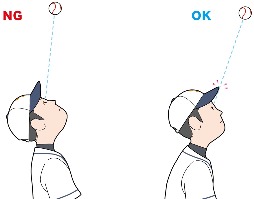 特に、キャッチャーフライはいわゆる戻ってくる打球になるので、必ず回転して後ろを向き、帽子を使ってひさしの前にボールをとらえるようにすると良いでしょう。