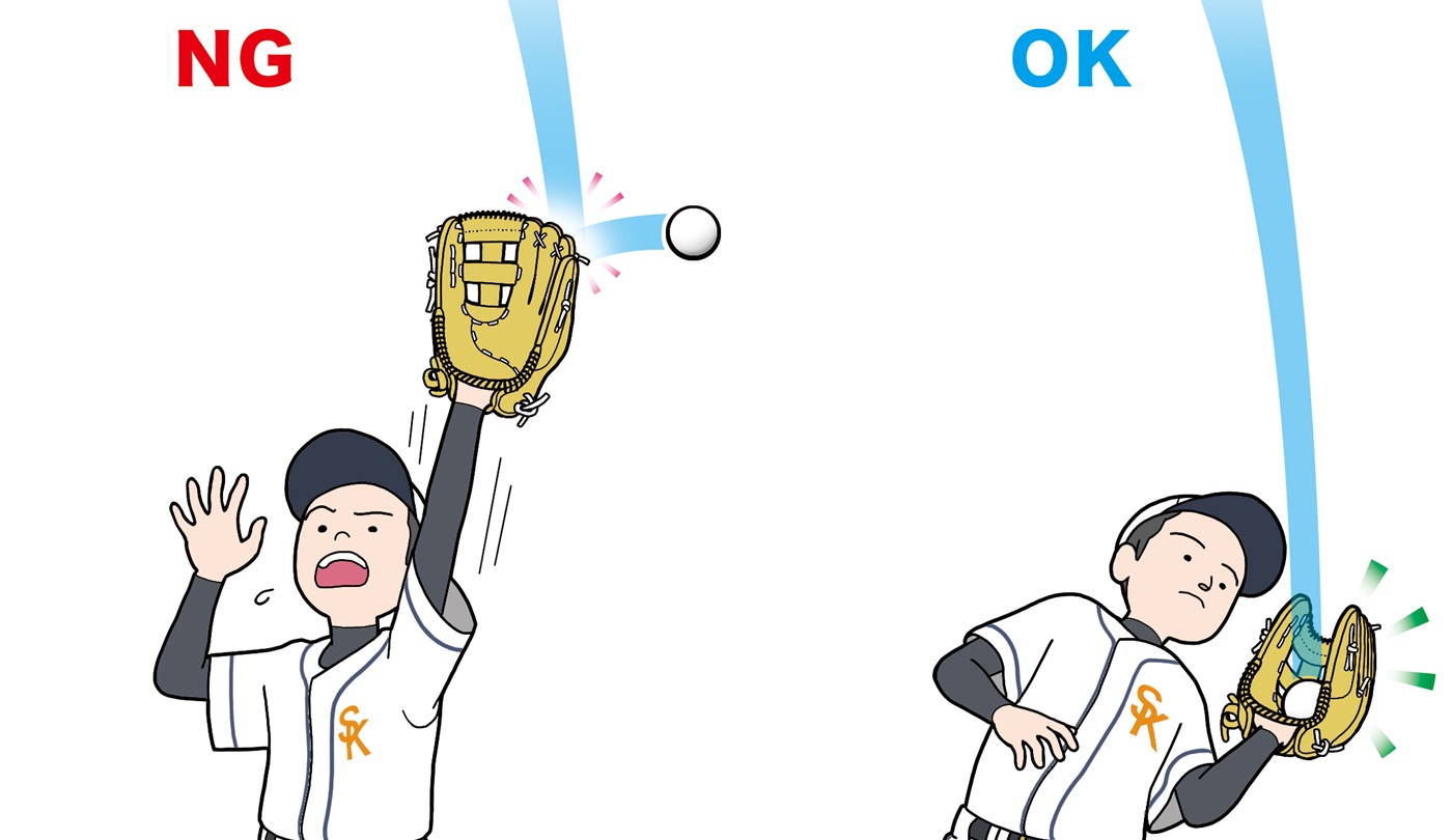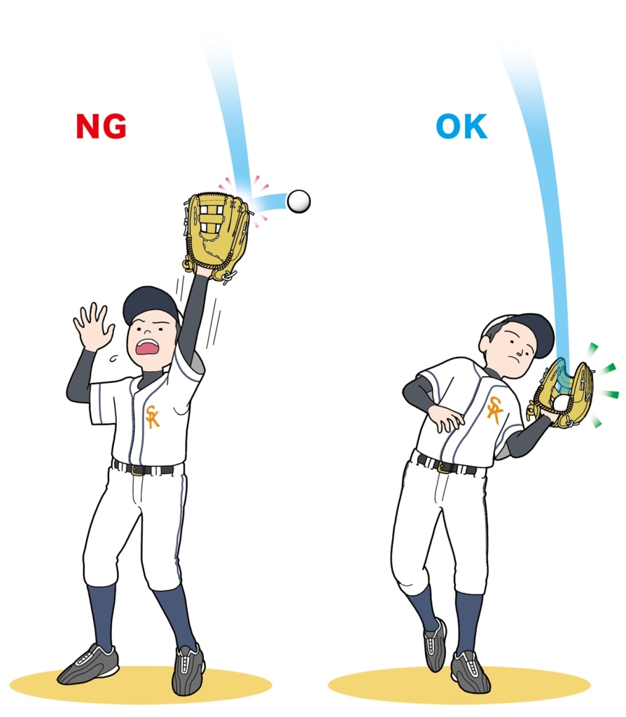 ボールの落下予測が難しいので、グラブを左肩の位置から引きながら腰のあたりまで下げながら捕球しても良いと思います。