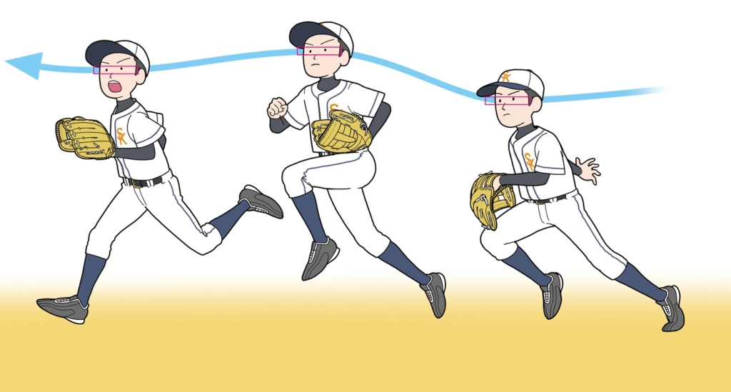2〜3歩くらいなら気にならなくとも、5メートルもボールを見て走ると、目線がブレてしまい一気にボールとの距離が掴めなくなります。外野手ならば学童でも10メートル以上走って追いつく打球もあります。