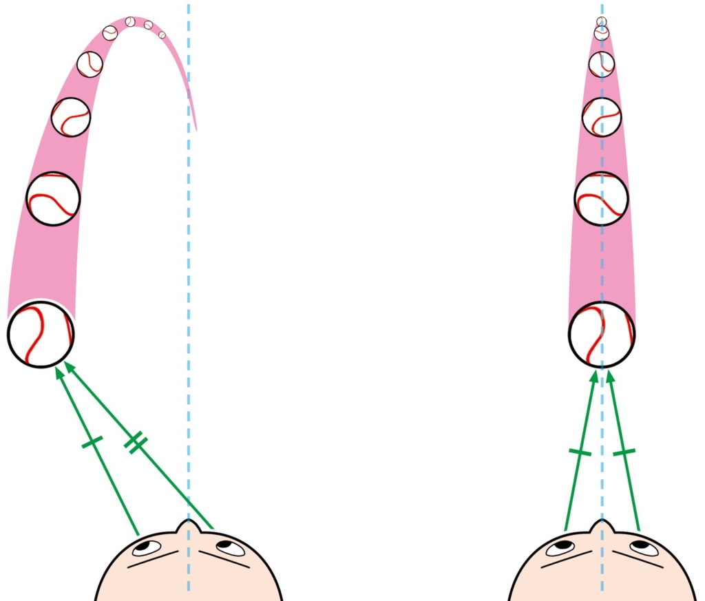 先ほどの正面の話に繋がりますが、距離を測るためには視差を作る方が距離を測りやすいです。打球の真正面に立つと、両目から等距離になるので距離を測ることが難しくなります。身体を少し斜め横向きに使うと距離を測りやすくなるので、正面のフライよりも少し左側の打球の方が捕りやすいことになります。