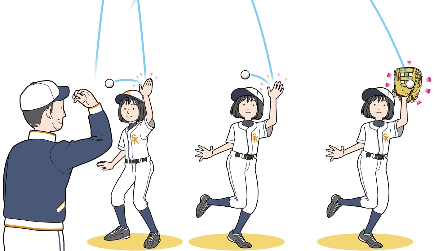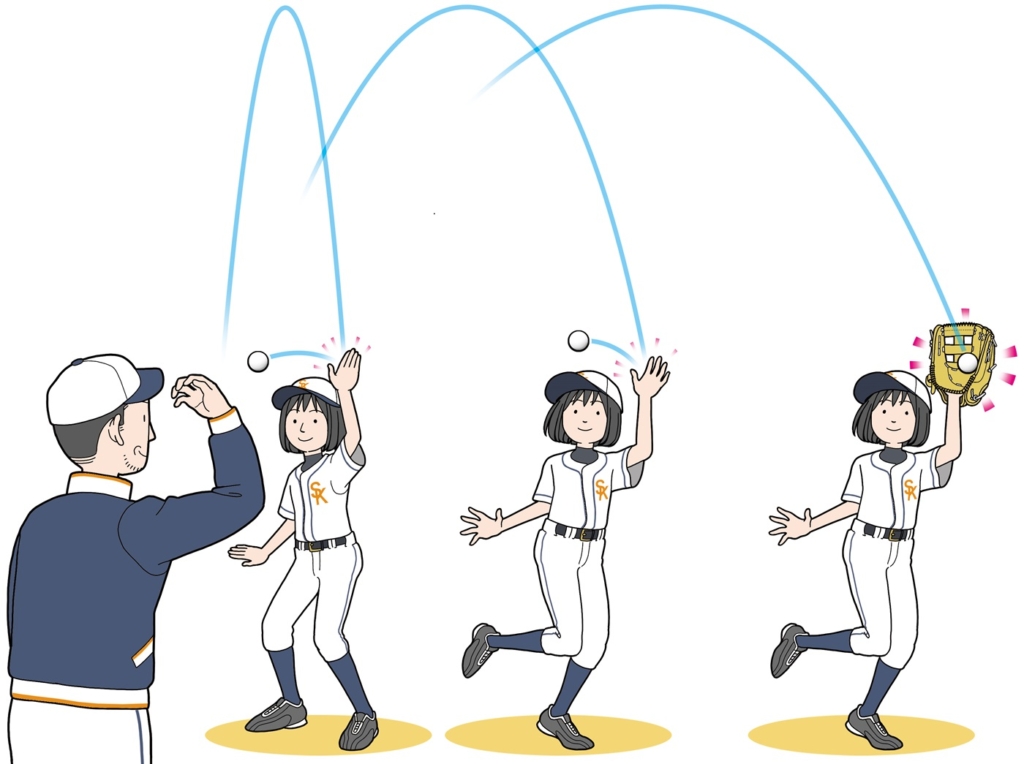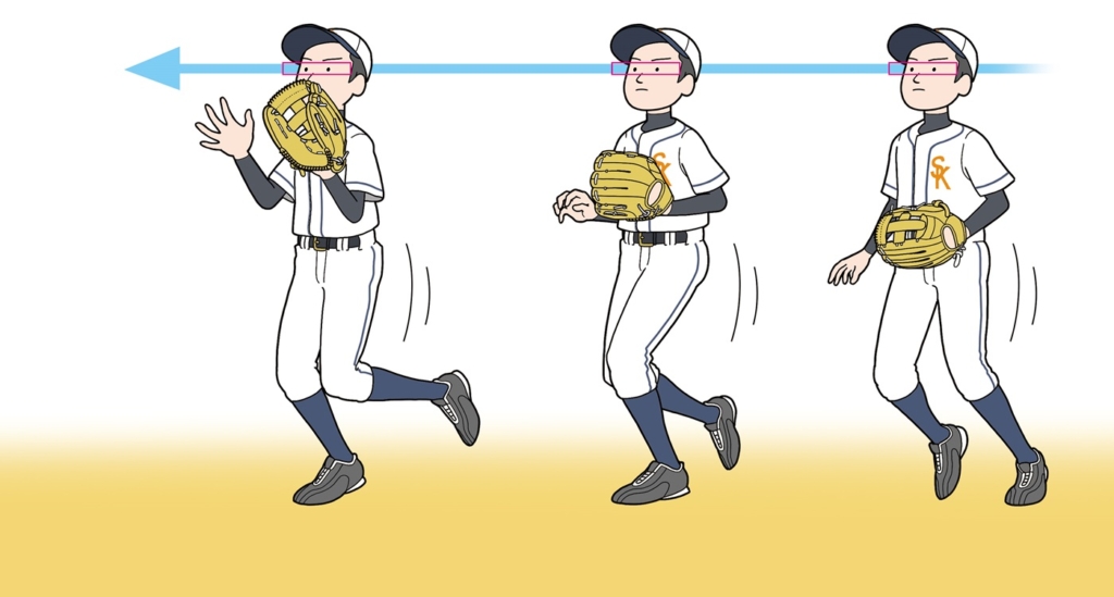まずは、スピードはなくて良いので「目線を上下させない」ように、小走りを使いましょう。歩幅を小さく速くして捕球するようにします。距離が必要になってきたら、最初はストライドを大きく、直ぐに小さくして目線を安定させましょう。少しずつ大きいストライドの歩数を増やすようにしてみて下さい。