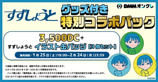DMMオンクレのプレイに必要なDC(3,500DC)と、すずしょうと「エモエモ缶バッジのやつぅ イラストバージョン3個セット」がセットになったDCパックを販売します。