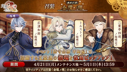召装『金環ノ理』のラインナップを更新いたしました。この召装では、イベント『防守任務「不如帰」』で活躍する「広津和郎」「トルストイ」「二葉亭四迷」の指環を一定の確率で入手できます。