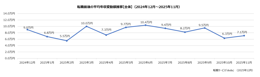 転職前後の平均年収変動額【全体】:+7.1万円(前月差:+0.8万円)