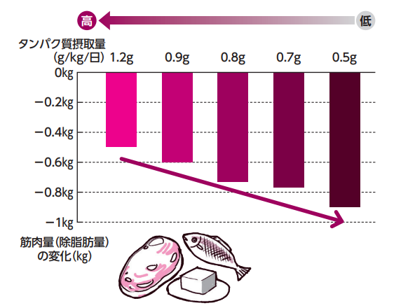 上のグラフは、高齢者を対象に、タンパク質の摂取量によって筋肉量がどのように変化するかを調査した結果を示しています。この調査では、タンパク質の摂取量が多い人ほど、筋肉量の減少が小さいことが分かりました。つまり、日々の食事でタンパク質をしっかりとることが、筋肉量の減少をゆるやかにすることにつながる可能性を示しています。