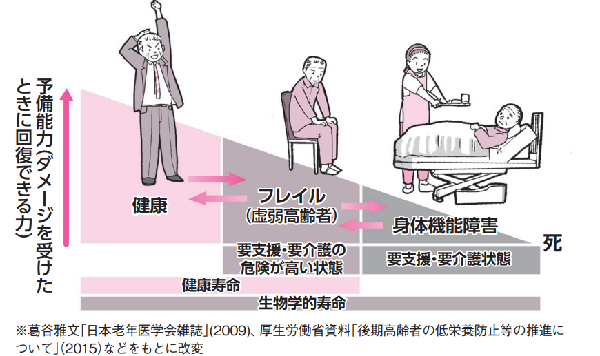 フレイルとは、健康と介護が必要な状態(寝たきりなど)との中間にあたり、フレイルになったとしても、運動や栄養によって心身の状態を改善させることは十分に可能です。