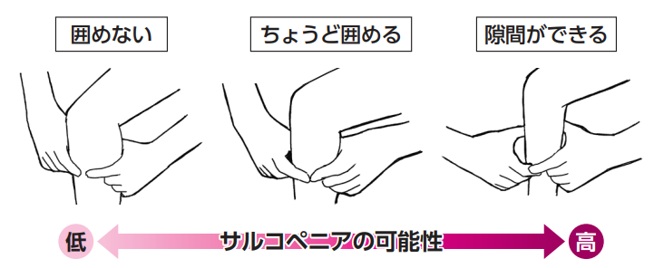 囲めない場合はサルコペニアの可能性は低く、囲んだ指とふくらはぎの間に隙間ができる場合はサルコペニアの可能性が高い。