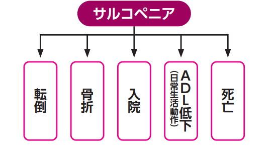 サルコペニアは転倒骨折、各種疾病への罹患や重症化、入院、要介護、さらには死亡などのリスクを高めることがわかっています。
