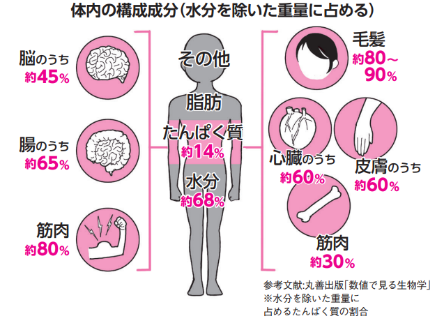 私たちの体は、水分や脂肪を含めて見ると全体の約14%がタンパク質です。ところが水分を除いて中身を見ると、筋肉の約80%、腸の約65%、心臓や皮膚の約60%など、体の中心はタンパク質でできていることが分かります。