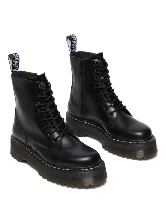 ドクターマーチンのアイコンである 8 ホールブーツに、厚底ソールを組み合わせた「JADON」は、誕生してから 11 年、ボリュームのあるシルエットが特徴。ブーツの内側にはサイドジップを採用し、脱ぎ履きしやすいのも人気のポイント。アッパー には艶やかなポリッシュド スムースレザーを使用。ホワイトウェルトステッチに、ヒールループもブラック×ホワイトのモノ トーンで仕上げた逸品。