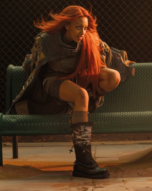 するミュータント的なコレクションともいえる。14XX Sub Boot は、取り外しなど調整可能なモジュラーデザインを アッパーに備え、寒さに対応するフリースライニングと防水・耐水性に優れた機能を持つ。モノクロームのカモプリン トがデザイン性を高め、マキシマリストなアプローチでブーツの概念を覆す。