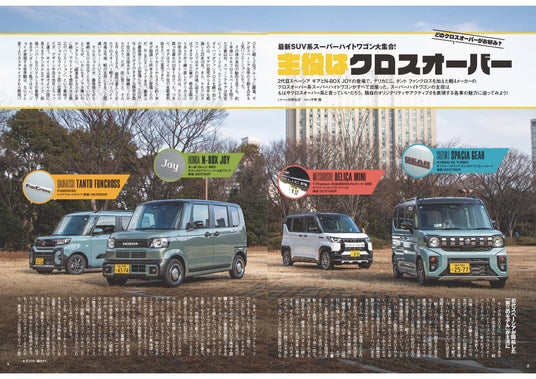 巻頭は「最新SUV系スーパーハイトワゴン」特集! 新登場N-BOX JOYと新型スペーシアギアにデリカミニとタントファンクロスを加えて、各車から出揃ったクロスオーバー車を一堂に集めて徹底比較しました。