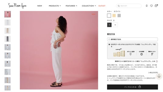 商品詳細ページの「梱包方法」でシェアバッグを選択すると、「Sea Room lynn」の商品がシェアバッグで届きます。シェアバッグを選んだ消費者は、ゴミやCO2排出量の削減に貢献できるだけでなく、梱包ストレス(※)を軽減したりクーポンなどの特典を獲得できます。