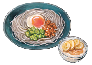 家で昼ごはんを食べる場合は、簡単で栄養素の豊富な一品料理をメインにするのがおすすめ。そばは炭水化物やビタミンB群などが豊富で、疲労回復にもぴったりです。トッピングには良質なたんぱく源である納豆と温泉卵、食物繊維やミネラルが豊富なオクラを。冷凍やコンビニのものを使えばより手軽です。デザートには、糖質や食物繊維、ビタミンが豊富なバナナと、植物性たんぱく質であるきなこを組み合わせたヨーグルトがおすすめ。