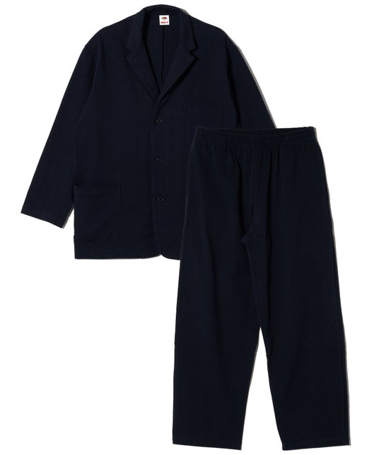 重厚感のあるコットン100%の12オンス・ヘビーウェイト天竺生地を使用し、従来のスーツ概念を覆す新しいスタイルを実現しました。