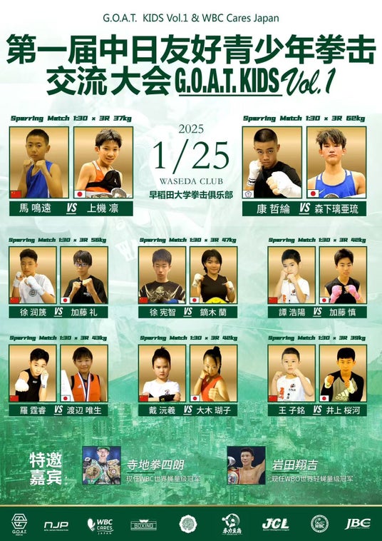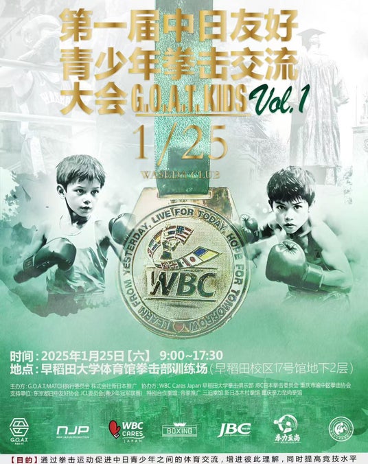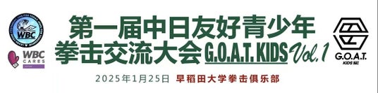 2025年1月25日(土)、早稲田大学ボクシングクラブにおいて、G.O.A.T. MATCH KIDS Vol.1 & WBC Cares Japanが主催する「第一回日中友好青少年ボクシング交流大会」が開催されます。本イベントは、日中両国の青少年ボクサーたちがボクシングを通じて競技と友情を分かち合う特別な機会を提供します。
