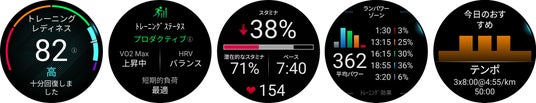 左から、トレーニングレディネス、トレーニングステータス、リアルタイムスタミナ、ランニングパワー、おすすめワークアウト
