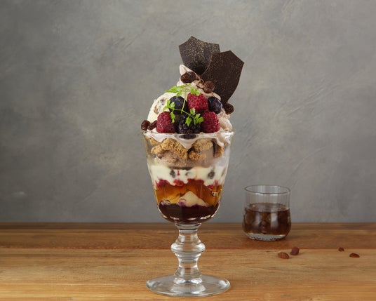 ほどよい酸味のカシスソース、洋梨、香り高いラム入りアールグレイジュレに、濃厚な味わいのグラスショコラベネズエラ を重ね、奥深いシャンティショコラを絞りました。上には、華やかな風味のグラスラムレザンをトッピング。ブルーベリー、フランボワーズ、ミュール、ラムレーズンなどを贅沢に飾った、大人のパフェをお楽しみいただけます。