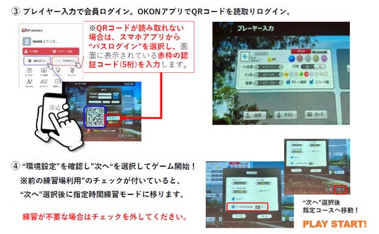 - プレイヤー入力で会員ログイン。OKONアプリでQRコードを読取りログイン。