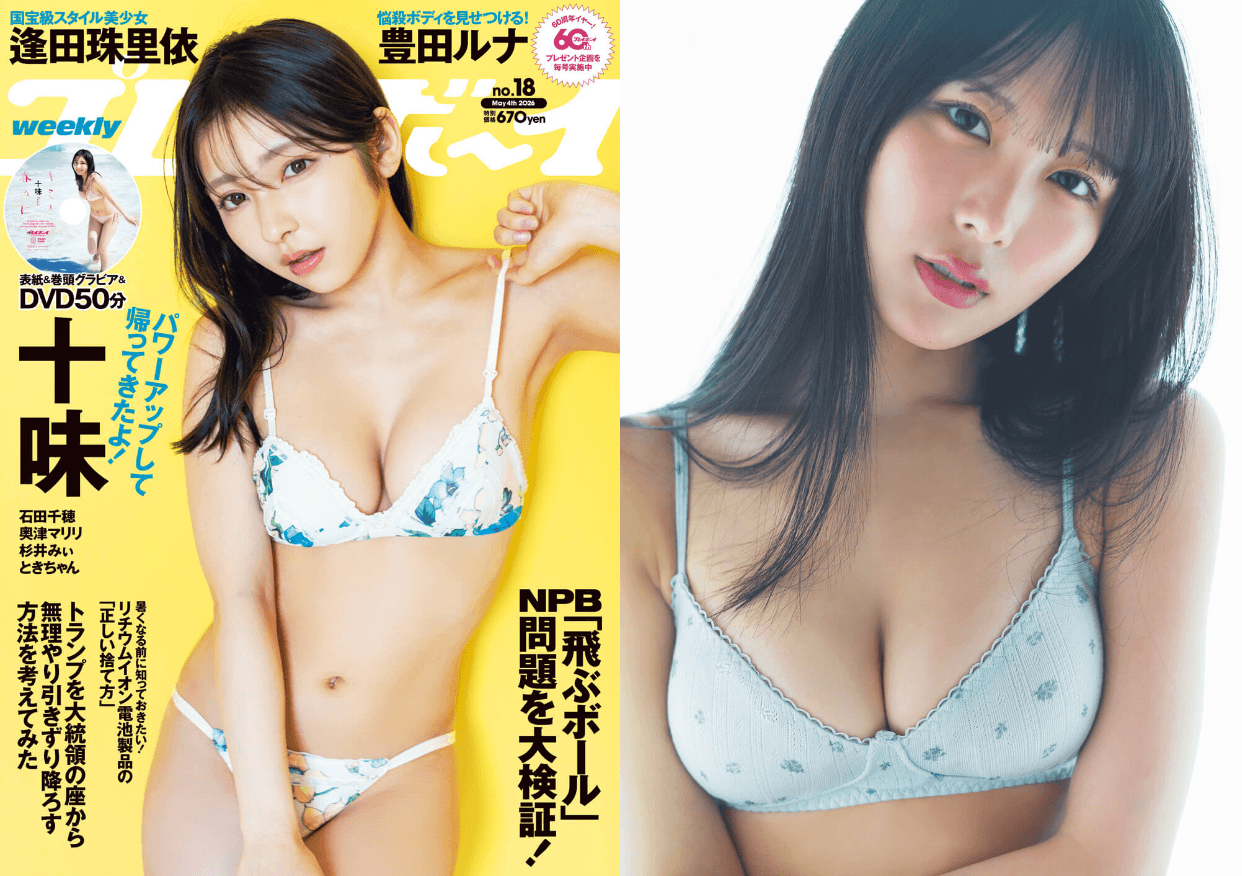 今号の『週プレ』は、十味の4年半ぶりの表紙&巻頭グラビアに鹿児島・与論島ロケ密着DVD映像はたっぷり50分! 国宝級スタイル美少女・逢田珠里依、豊田ルナが悩殺ボディを見せつける! などなど注目のグラビアが盛りだくさんの内容だ。