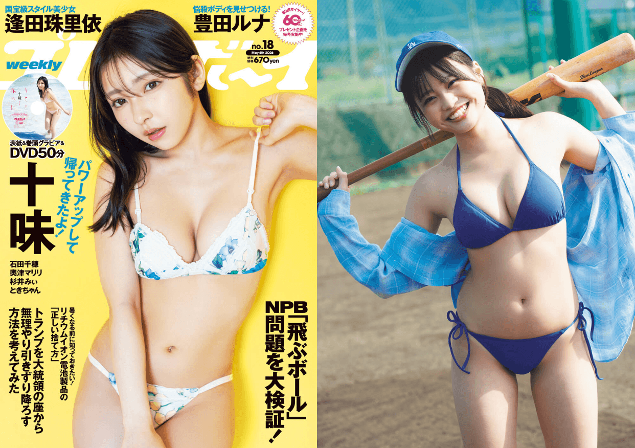 今号の『週プレ』は、十味の4年半ぶりの表紙&巻頭グラビアに鹿児島・与論島ロケ密着DVD映像はたっぷり50分! 国宝級スタイル美少女・逢田珠里依、豊田ルナが悩殺ボディを見せつける! などなど注目のグラビアが盛りだくさんの内容だ。