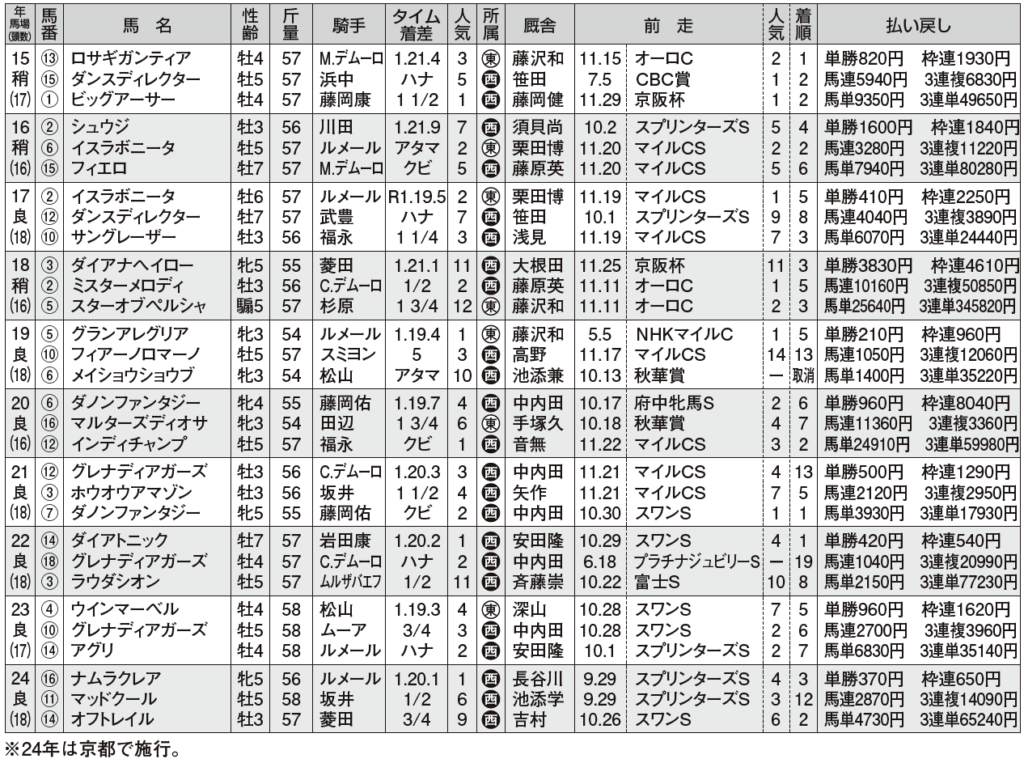 以前はマイルCS組が好成績を挙げていたが、過去2年はスワンS組とスプリンターズS組で3着以内を独占。短距離戦線を歩んだ馬が好走する傾向にシフトしている。