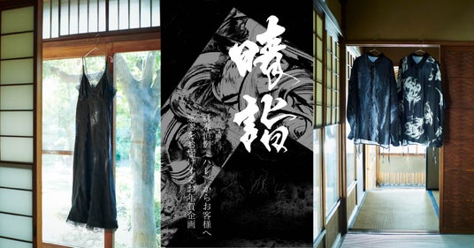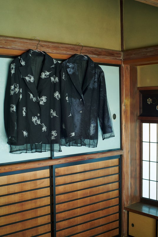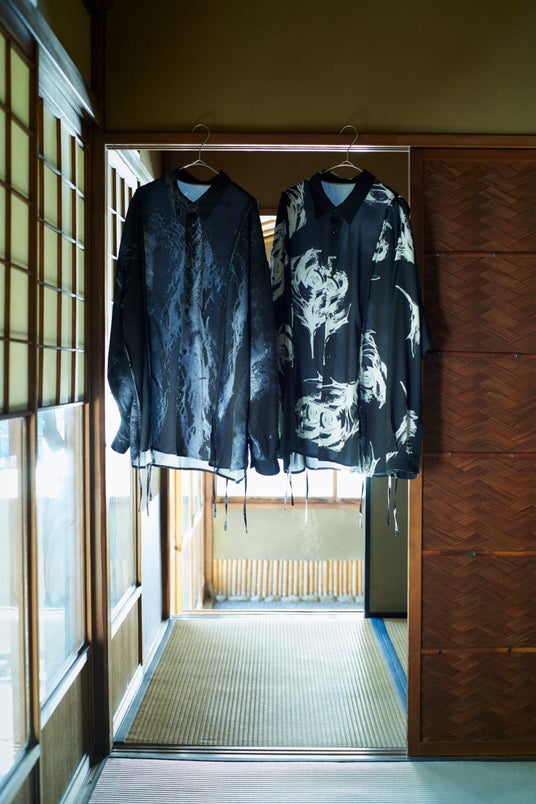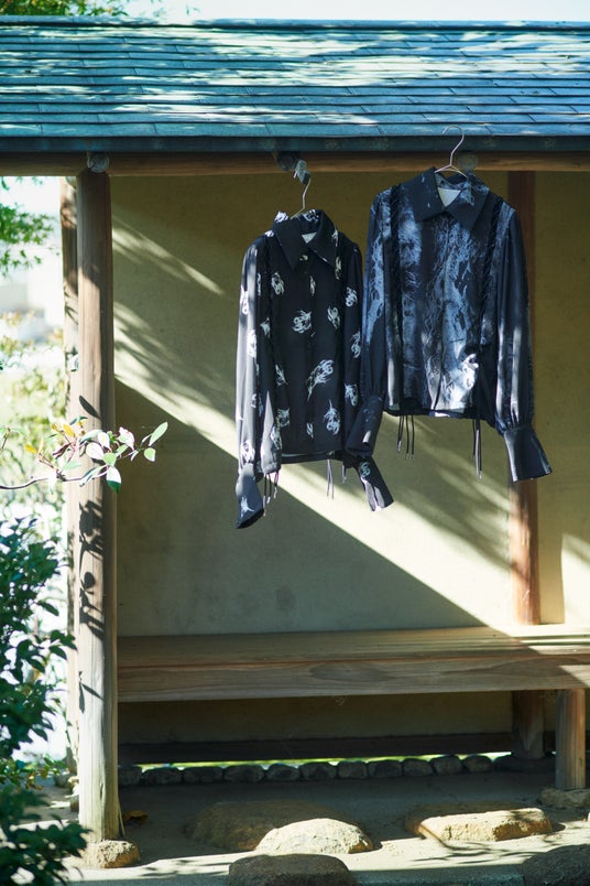 郷祥氏は書道をバックグラウンドにもち、独自開発した墨を使用した作品制作でART SHODO PLUS優秀賞などを受賞しています。書だけでなくサイエンスとクリエイティブ、和の融合した作品に感銘を受け、今回の起用に至りました。「白と黒」「人工美と自然美」といった「相反する二面性の共存」を表現する郷祥氏の作品を繊細なプリントで表現し、HAREらしい総柄シャツやレイヤードデザインのアイテムへ落とし込んだメンズ(ユニセックス)4型、レディース5型の豊富なラインアップとなっています。
