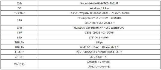 【Sword-16-HX-B14VFKG-5001JPの主な特徴】