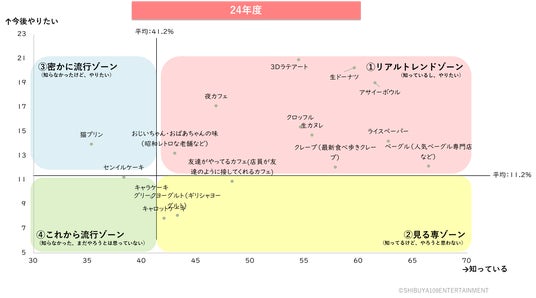 特に顕著な変化としては、2021年調査においてリアルトレンドゾーンに「おうちカフェ」「おうち居酒屋」など自宅で楽しめるものが多い傾向にありましたが、2024年調査では行列で話題の「生ドーナツ」や「夜カフェ」など、食べ歩きや外食を伴うコンテンツが多く挙げられました。