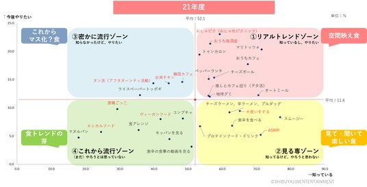 見る専ゾーンでは、コロナ禍で外出できないことから「ASMR」「激辛を食べる」など食べ物の動画を見ることで食のエンタメを楽しむ傾向にありましたが、2021年調査に比べて母数が減少し、実際の体験として楽しめる食トレンドに対し積極的になっていることがわかります。
