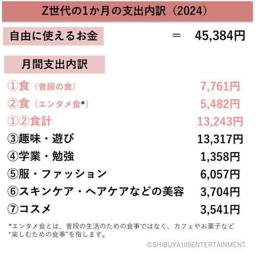 Z世代の自由に使える1か月の支出内訳を調査したところ、前回の調査同様、引き続き食への関心の高さがあらわれる結果となりました。