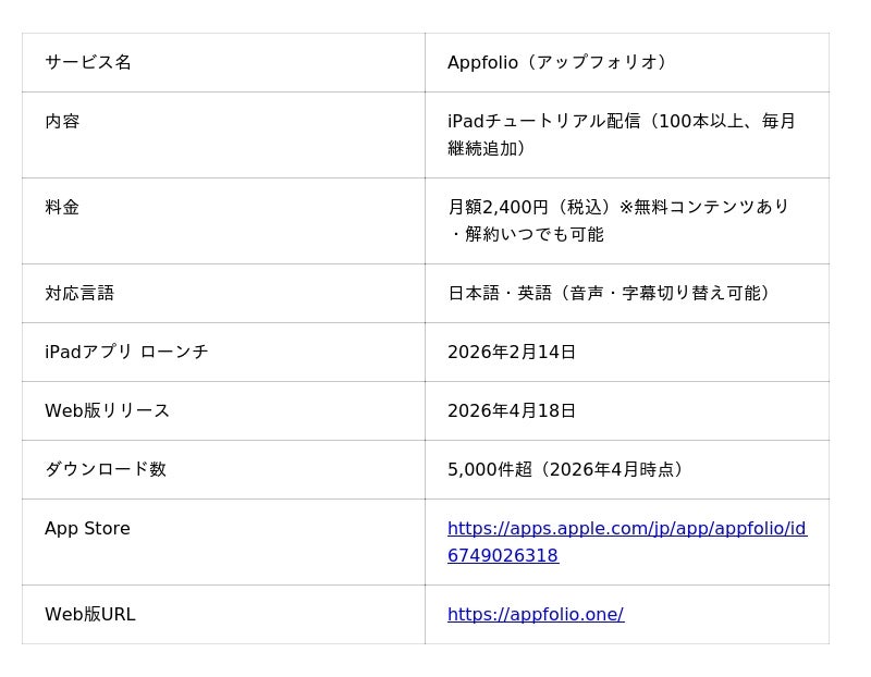 株式会社olio(代表:垣田 彩水、所在地:京都府)は、iPadのチュートリアルアプリ「Appfolio(アップフォリオ)」の本格展開を、2026年4月18日より開始します。