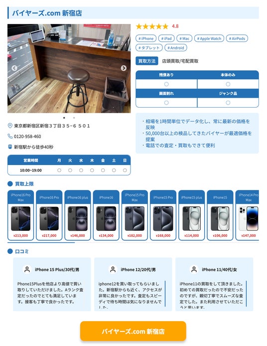 新品のiPhoneはもちろん、残債あり・画面割れなどの傷あり・ジャンク品の買取可否、機種ごとの買取上限価格や口コミなどの細かい情報も紹介しているので、様々な情報を一気に比較できます。