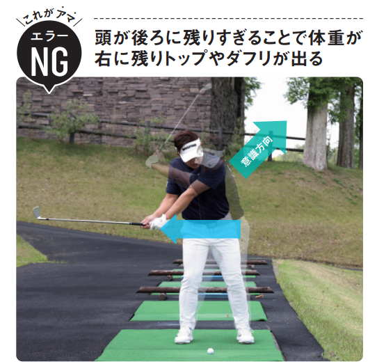 【NG】頭が後ろに残りすぎることで体重が右に残りトップやダフリが出る