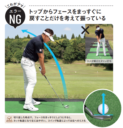 これがアマ!エラーNG:トップからフェースをまっすぐに戻すことだけを考えて振っている