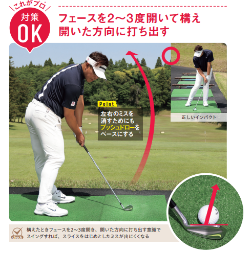 これがプロ!対策OK:フェースを2〜3度開いて構え開いた方向に打ち出す