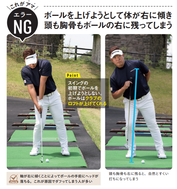 これがアマ!エラーNG:ボールを上げようとして体が右に傾き頭も胸骨もボールの右に残ってしまう
