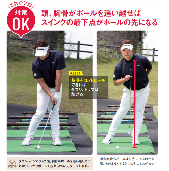 これがプロ!対策OK:頭、胸骨がボールを追い越せばスイングの最下点がボールの先になる