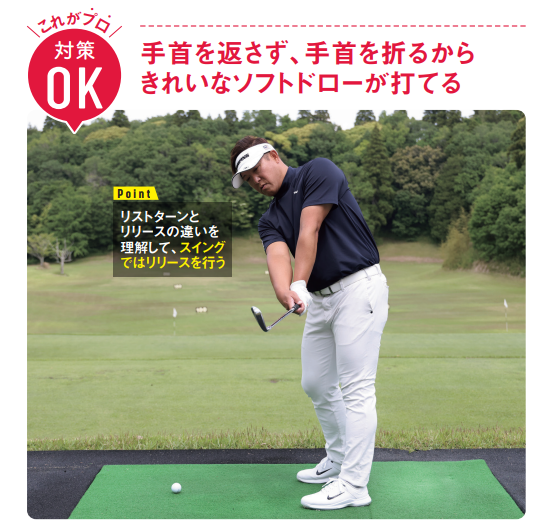 プロがやっているのは、リストターンではなく、右手首を手のひら側に、左手首を甲側に折る“リリース”。リリースすることによって正しくボールがつかまり、緩やかなドローが打てるのです。