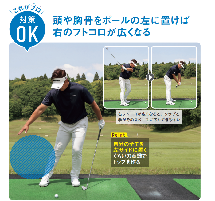 これがプロ!対策OK:頭や胸骨をボールの左に置けば右のフトコロが広くなる